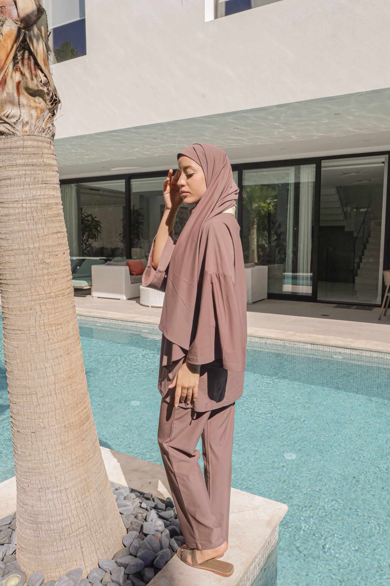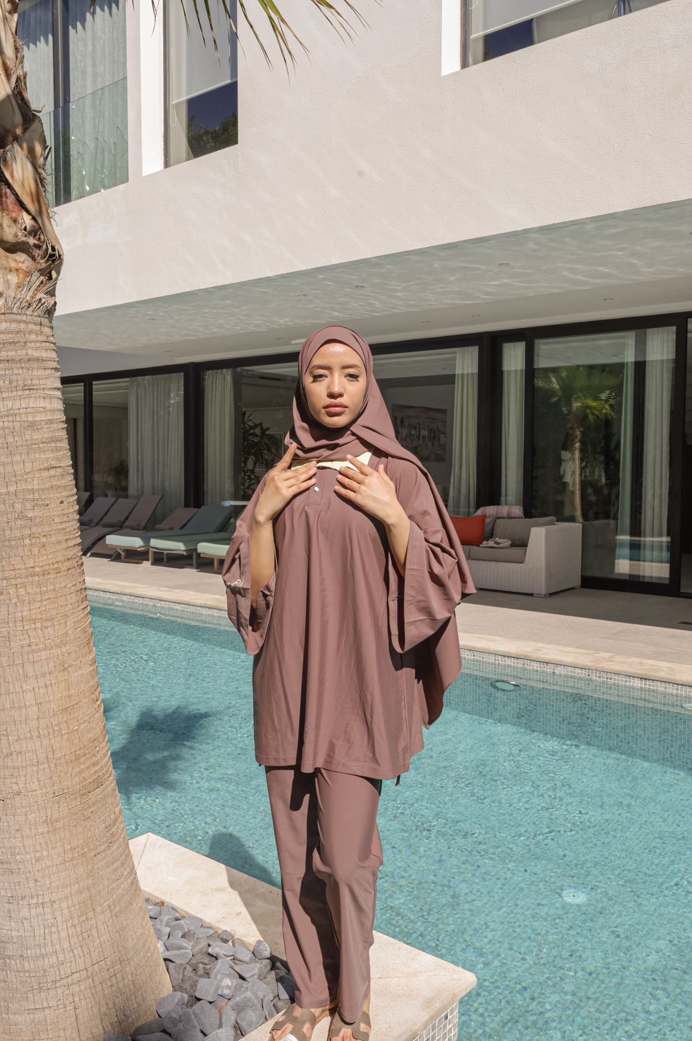 Notre maillot de bain pudique ou burkini est composé de 4 pièces : un haut à manche longue, un pantalon droit, un voile et un sac.