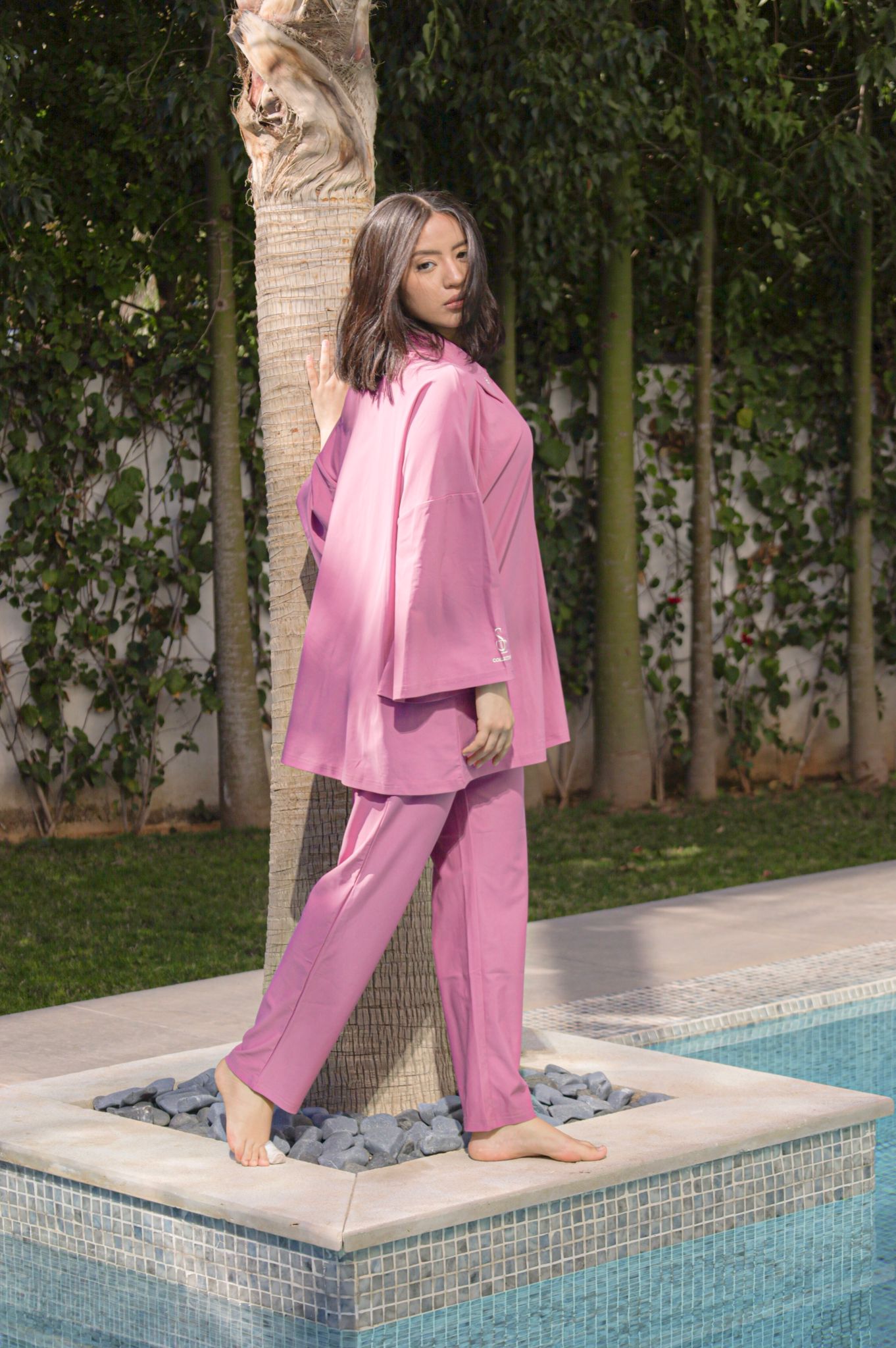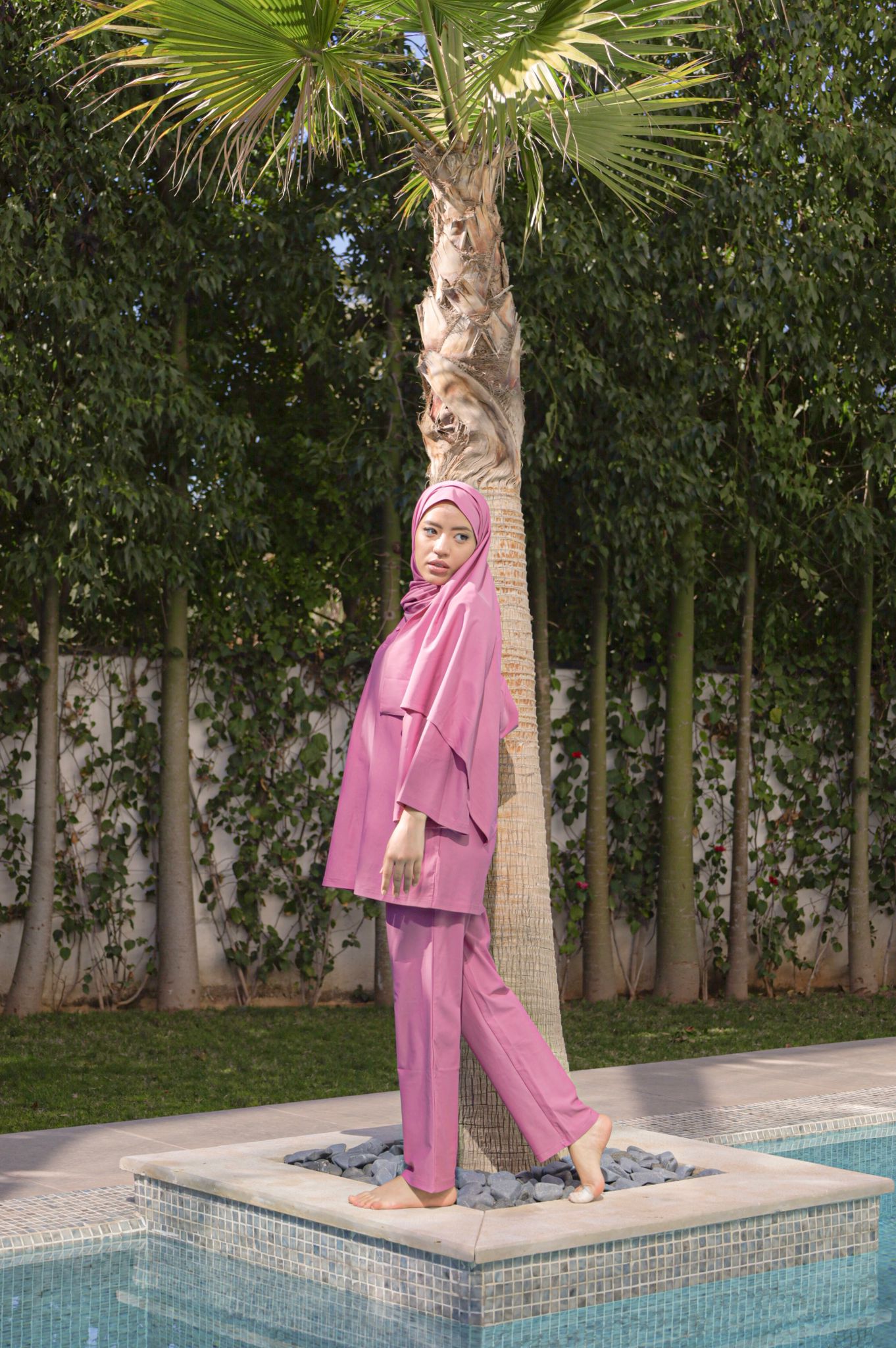 Notre maillot de bain pudique ou burkini est composé de 4 pièces : un haut à manche longue, un pantalon droit, un voile et un sac.